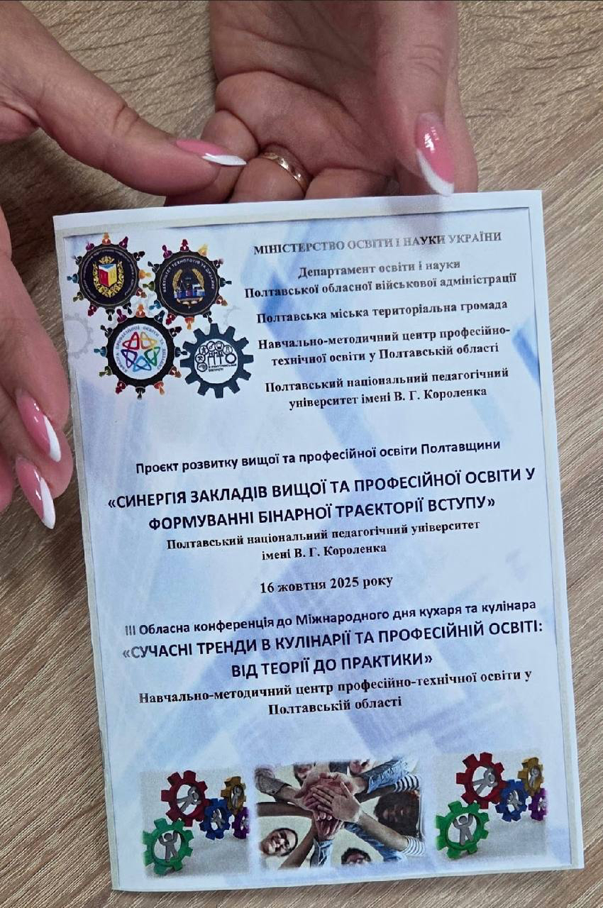 16 жовтня 2025 року студенти освітньої програми «Професійна освіта (Сфера обслуговування. Готельно-ресторанна справа)» факультету технологій та дизайну взяли участь у ІІІ обласній конференції до Міжнародного дня кухаря та кулінара «Сучасні тренди в кулінарії та професійній освіті: від теорії до практики», що відбулася на базі ПНПУ імені В. Г. Короленка. Захід проходив у конференц-холі факультету та об’єднав здобувачів освіти, викладачів університету, педагогів та навчальних майстрів професійно-технічних закладів освіти, стейкголдерів.