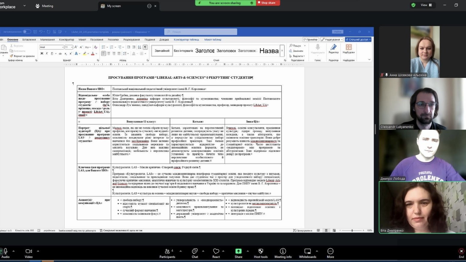 Основним питанням стала підготовка Delievrable D 4.2 «Five LA/LAS bachelor programmes’ recruitment strategies for regional UA HEI» від ПНПУ імені В. Г. Короленка у межах робочого пакету №4 «Work Package 4: Student recruitment and programmes’ piloting». Учасники наради обговорили і розробили стратегію просування програми «Liberal Arts & Sciences» та рекрутинг студентів. Було розроблено портрет цільової аудиторії при просування програми LAS та рекрутингу студентів. Це молоді люди, які ще не готові обрати вузьку професію, але прагнуть сучасної, «не нудної» освіти. Їх цікавить свобода вибору, можливість поєднувати різні інтереси та навчатися без зазубрювання. Вони активно користуються соціальними мережами та мислять візуально. Для них важливі самореалізація, мобільність і перспектива майбутнього. Їхні батьки зорієнтовані на перспективний розвиток дитини, зосереджують увагу не лише на майбутньому працевлаштуванні, а передусім на усвідомленому виборі професійної траєкторії. Такі батьки характеризуються відкритістю до інноваційних освітніх форматів, не демонструють консервативних освітніх установок та прагнуть бачити чіткі перспективи особистісного й професійного розвитку дитини. Іншими представниками цільової аудиторії є вчителі, освітні консультанти, працівники культури, лідери громад, випускники коледжів, а також абітурієнти, що змінюють освітню траєкторію. Вони добре розуміють цінність міждисциплінарності та гуманітарної освіти. Часто виступають «медіаторами» між програмою та абітурієнтами. Їхня підтримка підсилює довіру до програми.