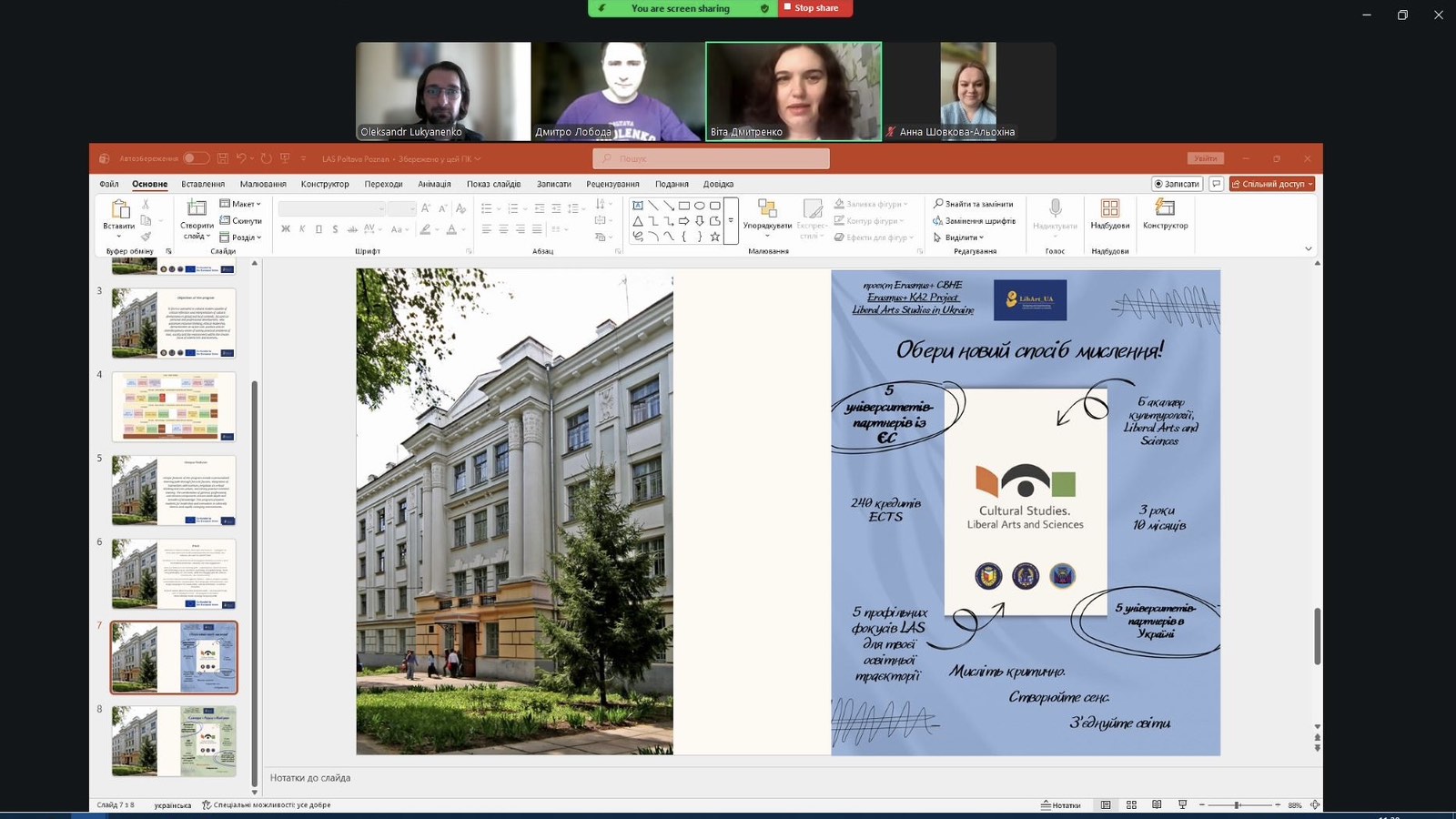 29 січня 2026 року відбулася зустріч учасників робочої групи міжнародного проєкту 101129385 – LibArt_UA – ERASMUS-EDU-2023-CBHE «Designing and Implementing Liberal Arts Studies in Ukraine» (LibArt_UA) у Полтавському національному педагогічному університеті імені В. Г. Короленка. У роботі взяли участь деканка факультету технологій та дизайну доцентка Юлія Срібна, начальник навчально- методичного відділу доцент Дмитро Лобода, начальниця відділу забезпечення якості освіти та акредитації Анна Шовкова-Альохіна, доцентка кафедри культурології, філософії та музеєзнавства Віта Дмитренко і менеджер проєкту LibArt_UA, завідувач кафедри культурології, філософії та музеєзнавства, професор Олександр Лук’яненко.