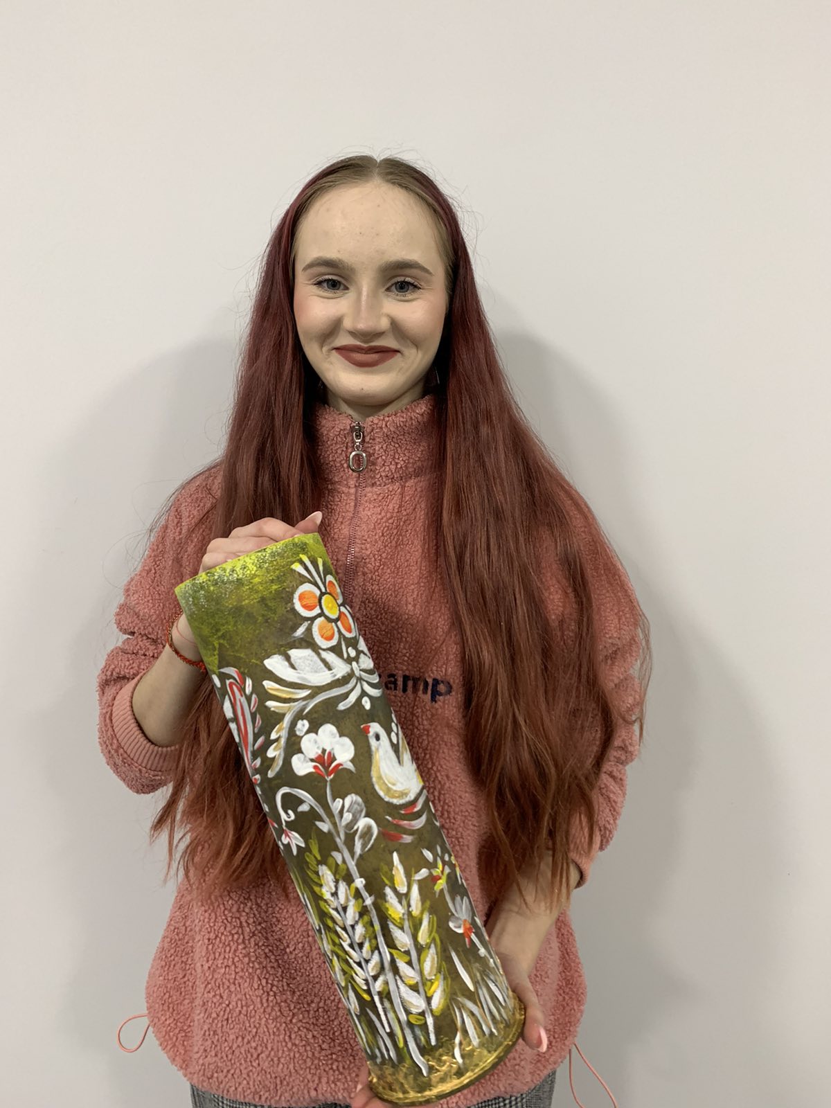 У творчій роботі студенти використали характерні елементи полтавського декоративного розпису: рослинні орнаменти, стилізовані квіти, птахів, притаманні регіональній художній традиції кольорові поєднання. Кожна гільза стала унікальним мистецьким об’єктом, що символізує незламність українського народу, трансформацію болю війни у силу творчості та віру в Перемогу.
