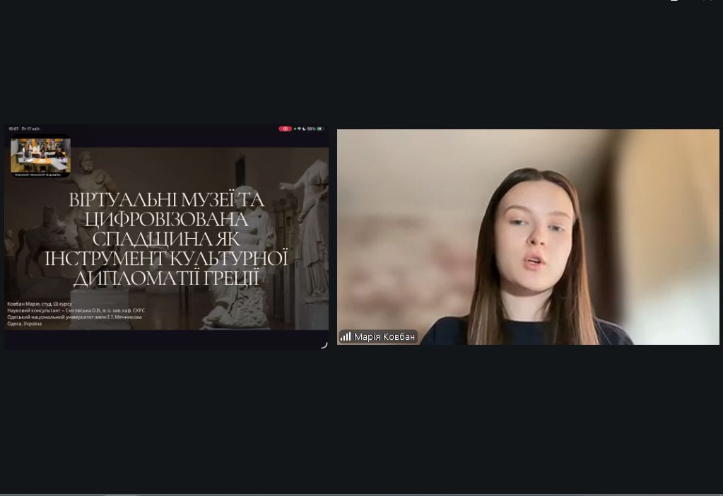 Здобувачка першого (бакалаврського) рівня вищої освіти Одеського національного університету імені І. І. Мечникова Ковбан розповіла про віртуальні музеї та цифровізовану спадщину як інструмент культурної дипломатії Греції. Студентка бакалавратури Полтавського національного педагогічного університету імені В. Г. Короленка Анастасія Федоренко представила доповідь про трансмісію культурного капіталу через систему освіти на основі поглядів П’єр Бурдьє. Здобувач освіти Ніжинського державного університету імені Миколи Гоголя Дмитро Черниш проаналізував музичні рок-фестивалі на прикладі фестивалю «Faine Misto» в контексті сьогодення молодіжної субкультури Україні. А аспірант Богдан Дешко кцентував увагу на філософському погляді на важливість сповідання православної віри як важливому коді ідентичності української нації